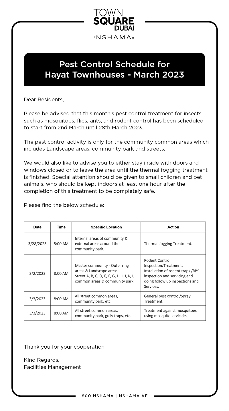 PEST CONTROL SCHEDULE FOR HAYAT TOWNHOUSES - MARCH 2023